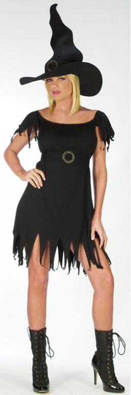 Costume Includes: Low cut tattered edge dress, belt and wavy witch hat.