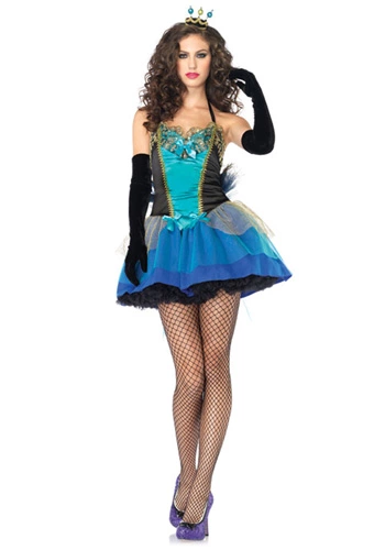 DressTail bow w/ trainHeadpieceFan your tail feathers to warn off any predators this Halloween in this sexy blue peacock beauty costume. The polyester dress has ornate, sparkly gold and teal decorations along the chest and down the front. It is black on the sides with a teal panel in the center. The dress has a halter-top style with black straps. It zips up in the back. The lower part of the dress has a blue base and layers of blue and teal tulle, as well as a layer of gold netting around the waist. The separate tail train has peacock-style feathers, a large black bow, and blue and teal tulle. It comes with a safety pin to attach to the dress. The small crown-like headpiece is black with ornate gold fringe and three glittering balls. It velcros closed and has straps so it can be secured to your hair with clips (not included). Add some black gloves and sexy fishnet stockings to complete your transformation into a sexy peacock!