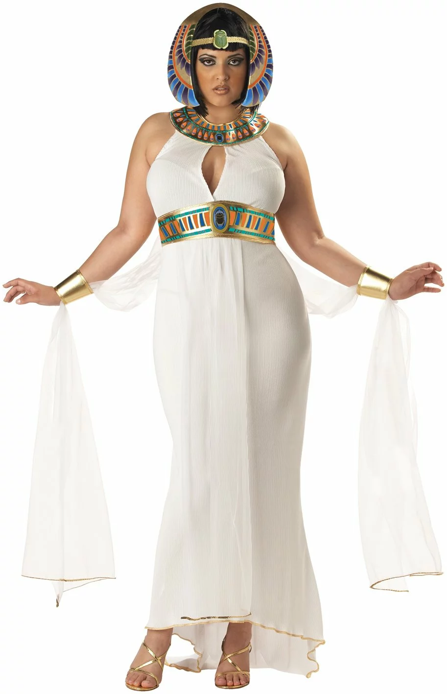 This enviable Egyptian queen is a force to be reckoned with. You’ll feel like real royalty at your next costume bash. Includes a fitted white dress with attached collar and drapes, decorative belt, cuffs and headpiece.