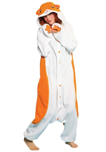 Hamster pajama bodysuitThink outside the cage this Halloween! This pajama-style bodysuit is made of soft polyester, with a white front and sleeves and an orange-brown back. Orange buttons line the front of the costume, and the orange wrist and ankle cuffs are lined with elastic. The attached hood has a smiling hamster face with sparkling eyes and padded ears that stick up. Pair with our guinea pig pajamas for a cool costume duo!