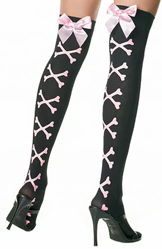 Black Nylons w/Pink Bows and CrossbonesThese black nylon stockings come up to the knees and have cute pink crossbones all the way down. A pink satin bow is attached at the top of each stocking and an elastic band is also in the stockings towards the top that keeps them firmly in place.