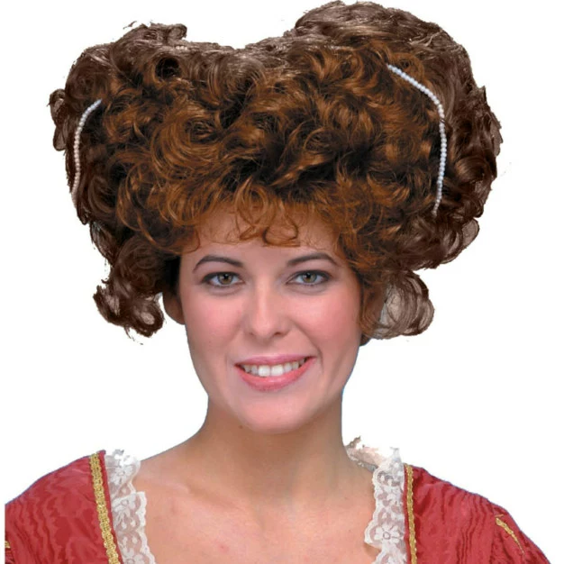 The Queen Elizabeth I Wig features dark auburn hair in ringlet curls placed in two large, loose buns on either side of the head. Strands of pearls give this hairstyle a regal finish. It is perfect for any Elizabethan costume!