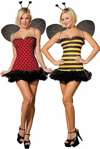 Fully Reversible Ladybug / Bumble Bee DressRemovable Clear Shoulder StrapsAntenna HeadbandWingsCreate a real buzz at your next Halloween party in this reversible ladybug/bumble bee costume. The two-in-one costume consists of a polyester and spandex dress that has a red and black ladybug print on one side and a yellow and black bumble bee print on the other. Both sides are lined with black lace at the top and have a black, layered skirt. The black wings are accented with silver glitter and strap onto the back with elastic bands. A black antenna headband with hearts completes this costume. Add a pair of our mary jane shoes or black fishnet stockings for a sexy look.