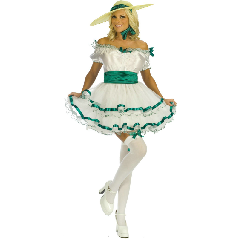 The Sexy Southern Belle costume includes a white and green dress, green belt and matching hat. Whether you’re drinking lemonade on the front porch or strolling through the streets, you’ll be sure to show them that you are a Lady in this costume!